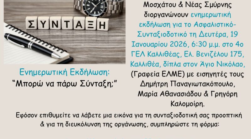Διαβάστε περισσότεραOι ΣΕΠΕ & ΕΛΜΕ Καλλιθέας-Μοσχάτου & Νέας Σμύρνης διοργανώνουν ενημερωτική εκδήλωση για το Ασφαλιστικό-Συνταξιοδοτικό τη Δευτέρα, 19 Ιανουαρίου 2026, 6:30