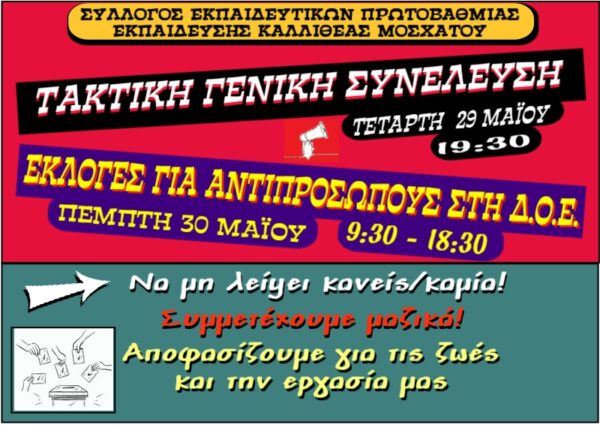 Η Τακτική Γενική Συνέλευση του Συλλόγου μας θα πραγματοποιηθεί την Τετάρτη 29 Μαΐου 2024, στο 3ο Δημοτικό Σχολείο Καλλιθέας (είσοδος από Πλάτωνος 88, Καλλιθέα), στις 19:30 και η εκλογική διαδικασία για την ανάδειξη αντιπροσώπων στην 93η Γ.Σ. της ΔΟΕ θα διεξαχθεί δια ζώσης, την Πέμπτη 30 Μαΐου 2024, από τις 09:30 έως τις 18:30.
