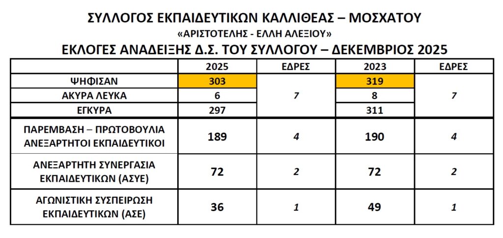 ΑΝΑΚΟΙΝΩΣΕΙΣ Αποτελέσματα εκλογών 9ης Δεκεμβρίου 2025 για την ανάδειξη νέου ΔΣ του ΣΕΠΕ Καλλιθέας Μοσχάτου 16 Δεκεμβρίου 2025 admin