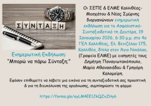 Oι ΣΕΠΕ & ΕΛΜΕ Καλλιθέας-Μοσχάτου & Νέας Σμύρνης διοργανώνουν ενημερωτική εκδήλωση για το Ασφαλιστικό-Συνταξιοδοτικό τη Δευτέρα, 19 Ιανουαρίου 2026, 6:30 μ.μ. στο 4ο ΓΕΛ Καλλιθέας, Ελ. Βενιζέλου 175, Καλλιθέα, δίπλα στον Άγιο Νικόλαο,