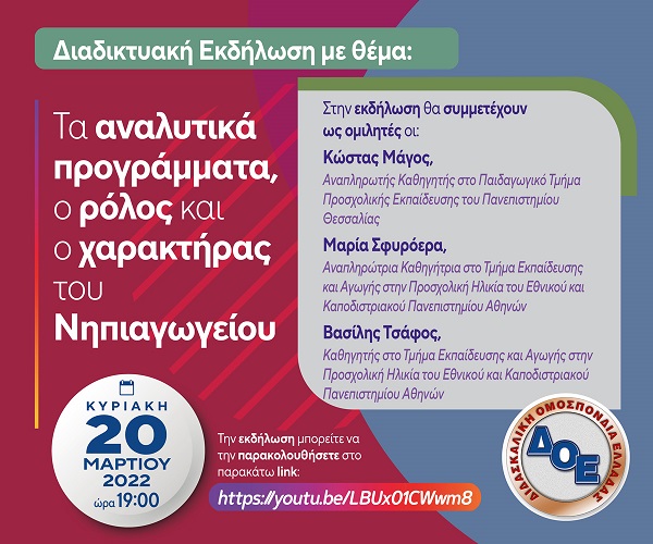 3η κεντρική δράση ΔΟΕ, Κυριακή 20 Μαρτίου, 7:00 μ.μ. «Τα αναλυτικά προγράμματα, ο ρόλος και ο χαρακτήρας του Νηπιαγωγείου»