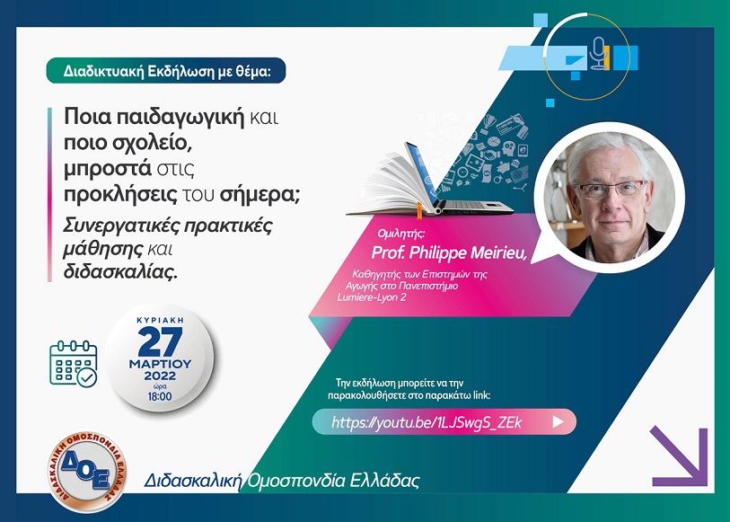 Ομιλητής: Philippe Meirieu, καθηγητής Επιστημών της Αγωγής στο Πανεπιστήμιο Lumière – Lyon 2, ερευνητής στη Φιλοσοφία της Παιδαγωγικής και της Εκπαίδευσης, δοκιμιογράφος και συγγραφέας.