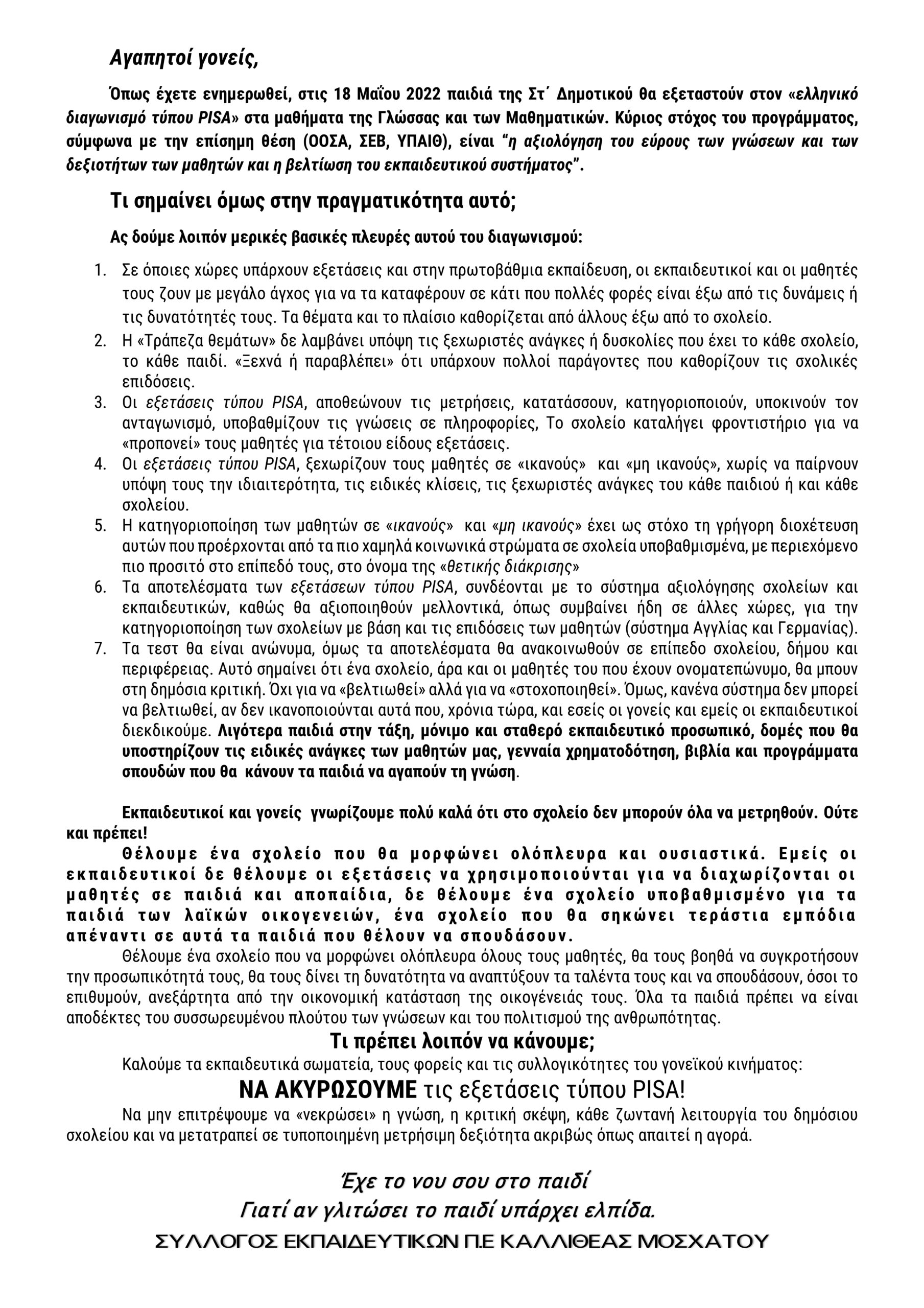 ΑΝΑΚΟΙΝΩΣΕΙΣ Εξετάσεις τύπου PISA-Επιστολή του ΣΕΠΕ Καλλιθέας Μοσχάτου προς τους γονείς των μαθητών μας 9 Μαΐου 2022 admin