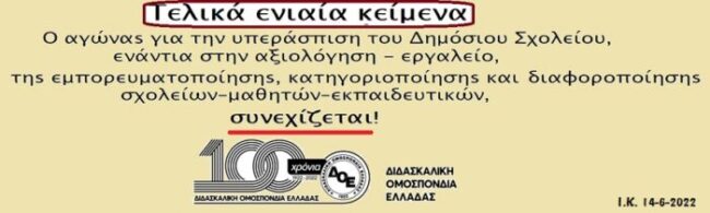 Τα τελικά κείμενα που στέλνει η Δ.Ο.Ε., όπως και όλα όσα έστειλε μέχρι τώρα (Φάσεις Β1, Β2, Β3) υπηρετούν τον στόχο να μην διαφοροποιηθούν τα σχολεία, να μην μετατραπούν σε ανταγωνιζόμενες, κατηγοριοποιημένες σχολικές μονάδες. Στα πλαίσια αυτά καλούμε τους συλλόγους διδασκόντων να επιλέξουν για όλους τους άξονες, στην 4βαθμη κλίμακα βαθμολόγησης, τον υψηλότερο βαθμό (4), ώστε να μην υπάρχει η δυνατότητα ποσοτικής διάκρισης μεταξύ των σχολείων.